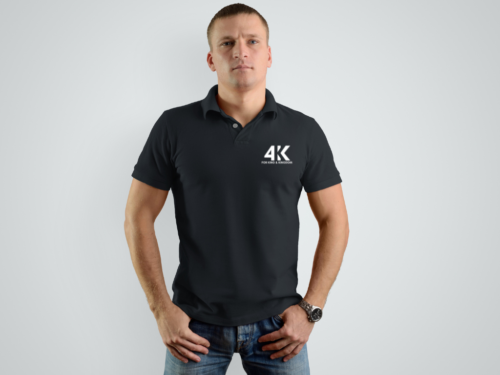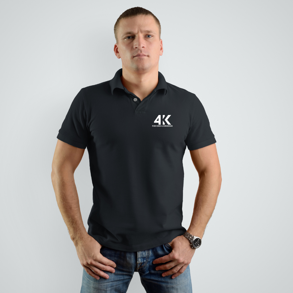 Black polo shirt with embroidered 4KK logo.